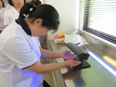 講義は文部科学省が定める「学校給食調理員の標準的研修プログラム」に基づき実施し、実習は「ATP拭き取り検査」及び「手洗いチェッカーによる検査」を参加者全員で行いました。